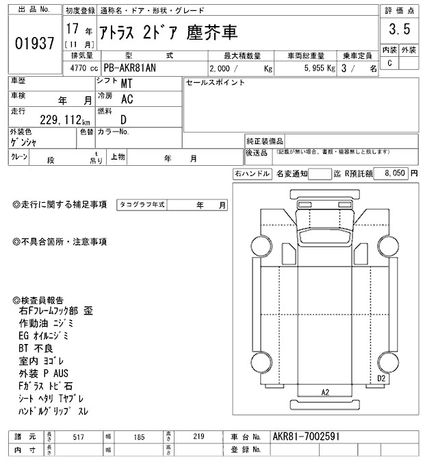 Год выпуска2005 Пробег 229 000 км КузовAKR81AN Комплектация GARBAGE