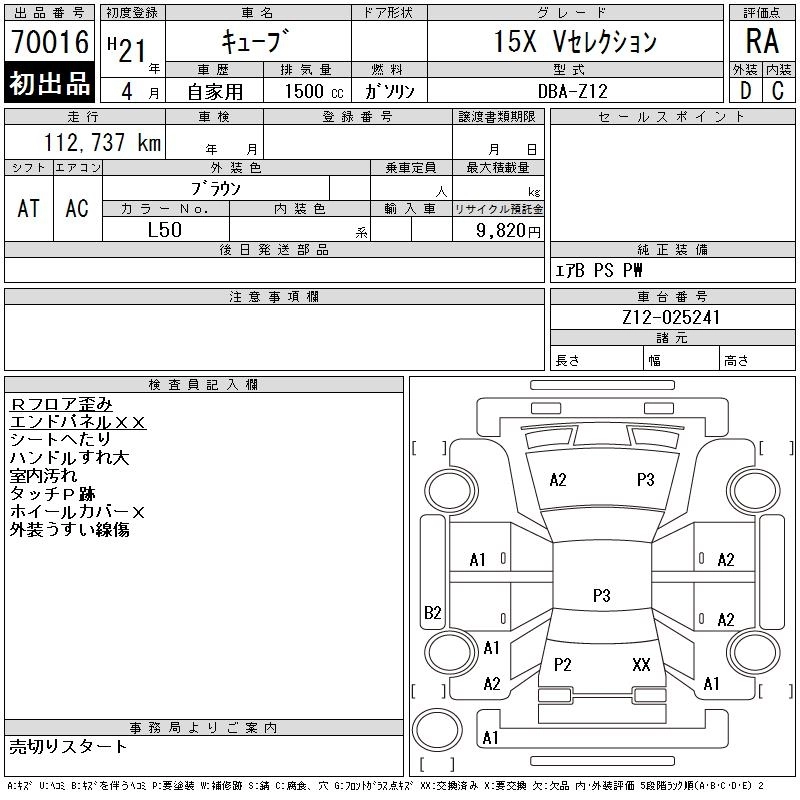 NISSAN CUBE 2009 г., лот № 70016