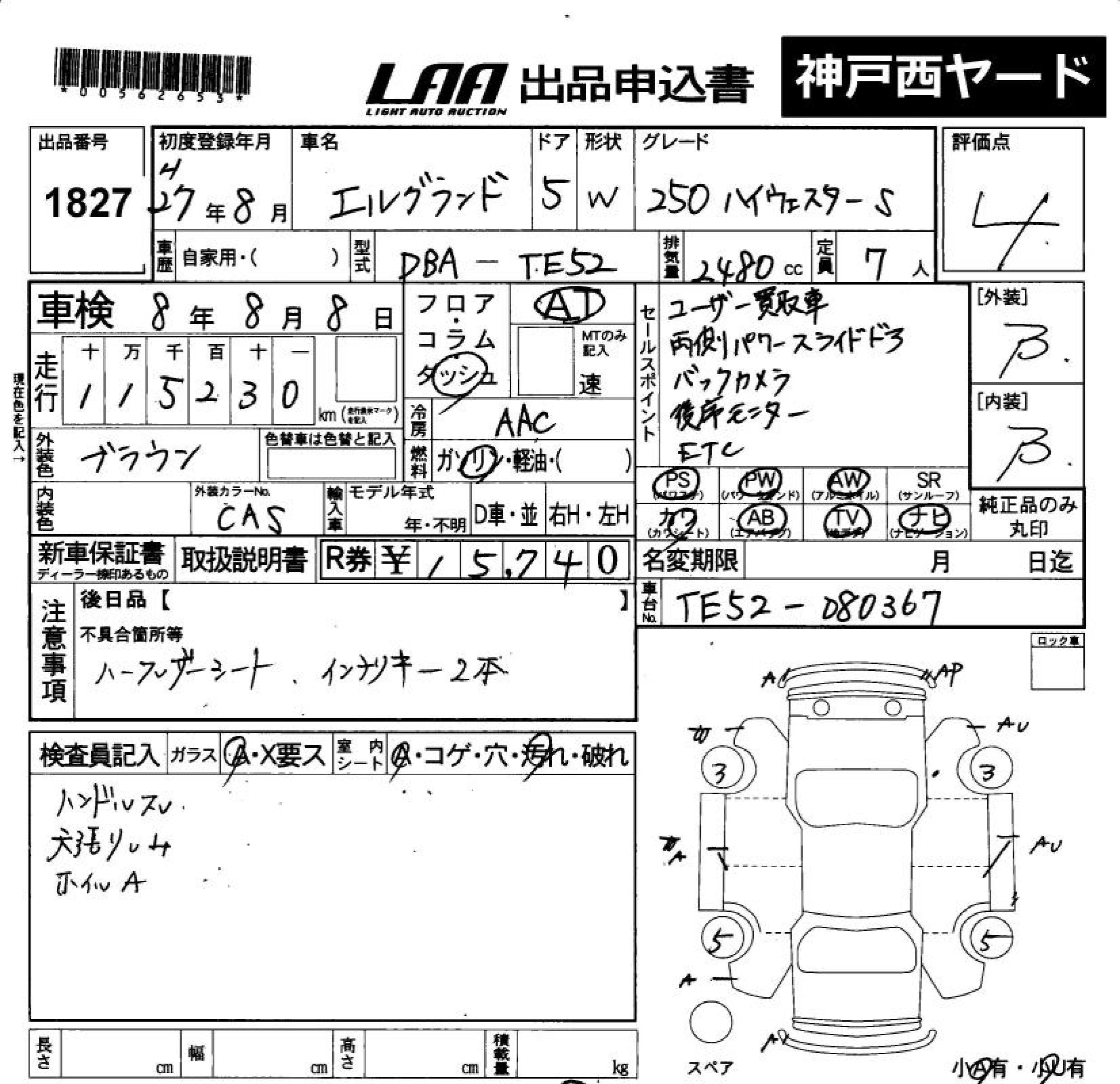 NISSAN ELGRAND 2015 г., лот № 1827