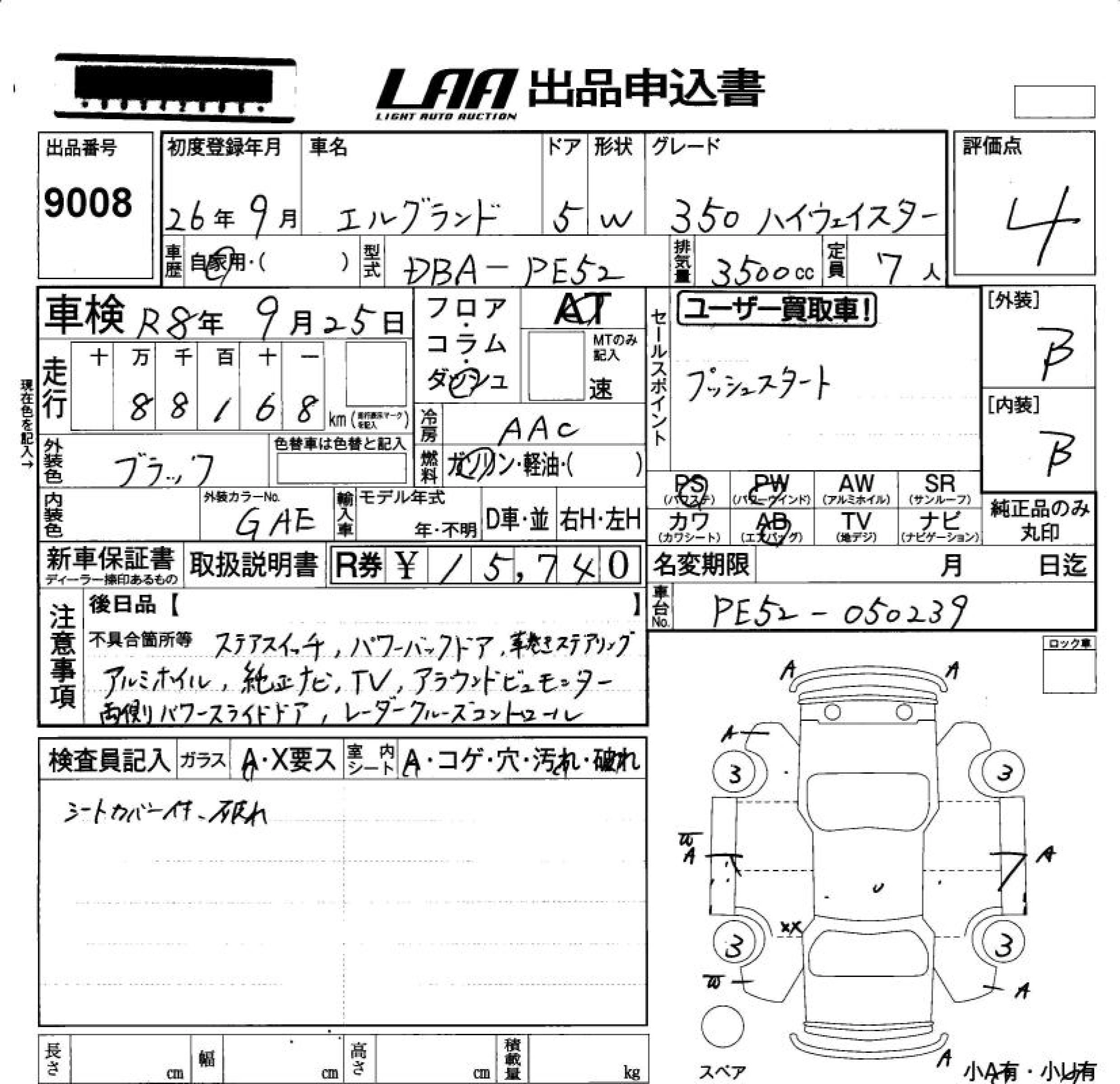 NISSAN ELGRAND 2014 г., лот № 9008