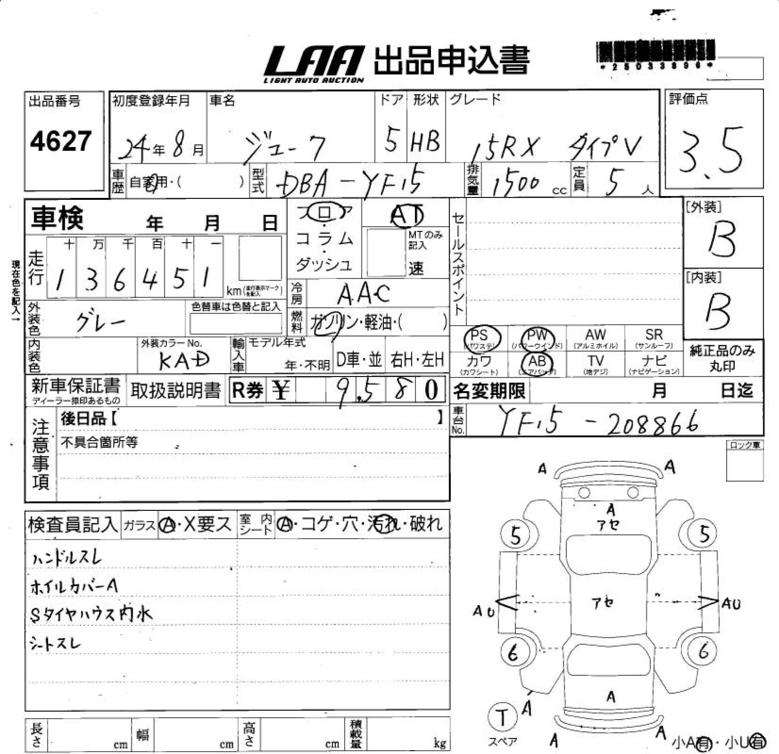 Год выпуска2012 Пробег 136 000 км КузовYF15 Комплектация15RX TYPE V