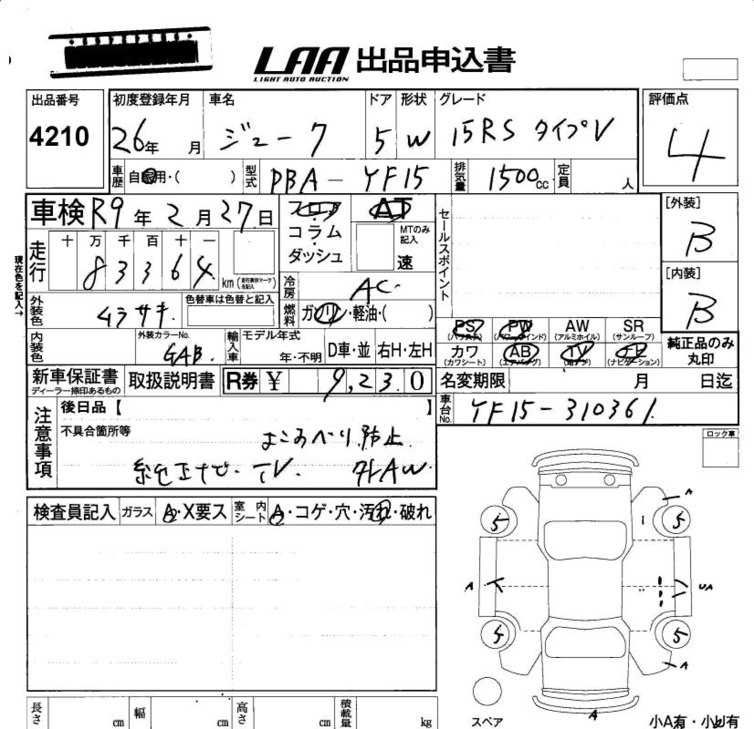 Год выпуска2014 Пробег 83 000 км КузовYF15 Комплектация15RS TYPE V