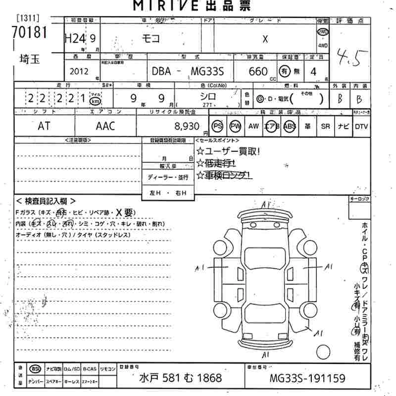Статус продан Лот 70181 Аукцион MIRIVE Saitama Дата аукциона 24.12.2025