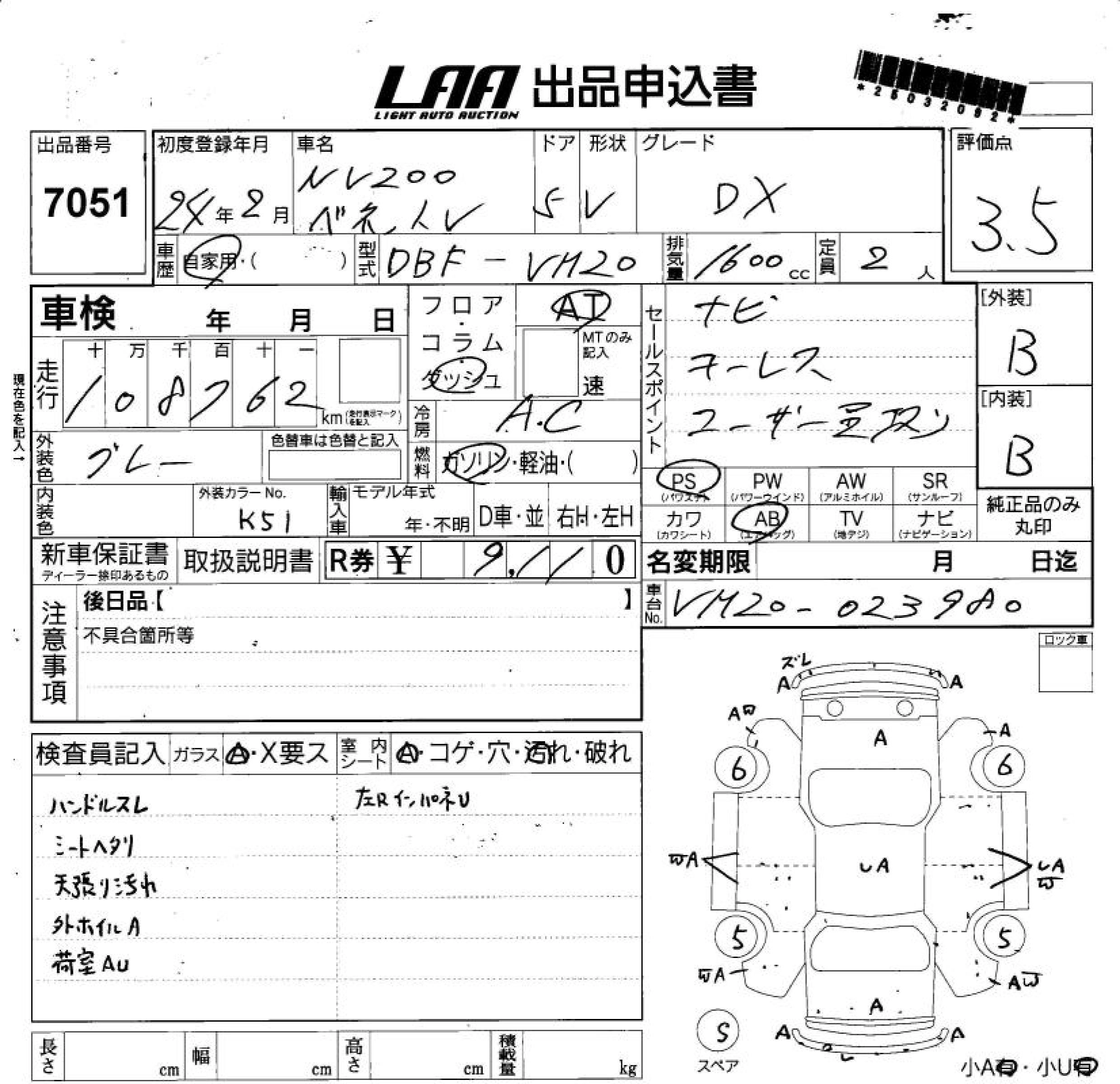 NISSAN NV200 VANETTE VAN 2012 г., лот № 7051