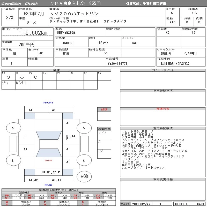 111 000 км КузовVM20 Комплектация CHAIR CAB [ WHEELCHAIR 1 NAME SPECIFICATION ]/ SLOPE TYPE
