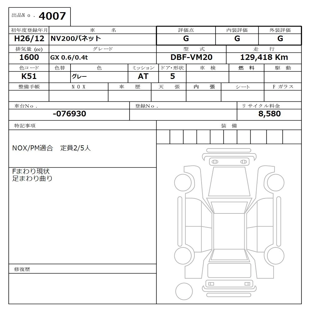 NISSAN NV200 VANETTE 2014 г., лот № 4007
