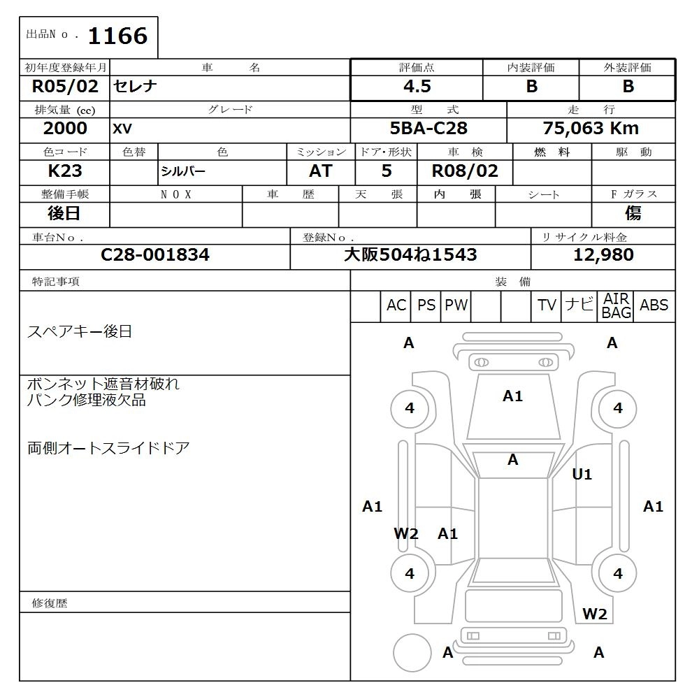 Статус продан Лот 1166 Аукцион Nissan Osaka Дата аукциона 08.12.2025