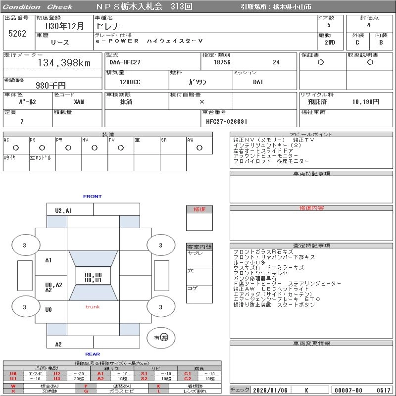 Статус выставлен на аукцион Лот 5262 Аукцион NPS Tochigi Дата аукциона 27.01.2026