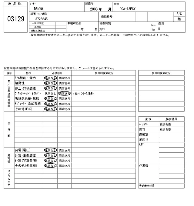 Год выпуска2003 КузовDCA-13ESY КомплектацияDENYO ELECTRICAL GENERATOR