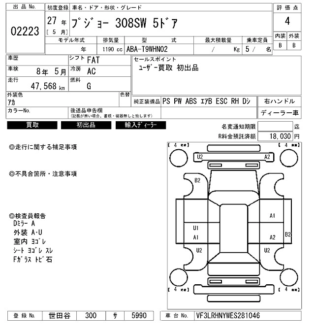 PEUGEOT 308 2015 г., лот № 2223
