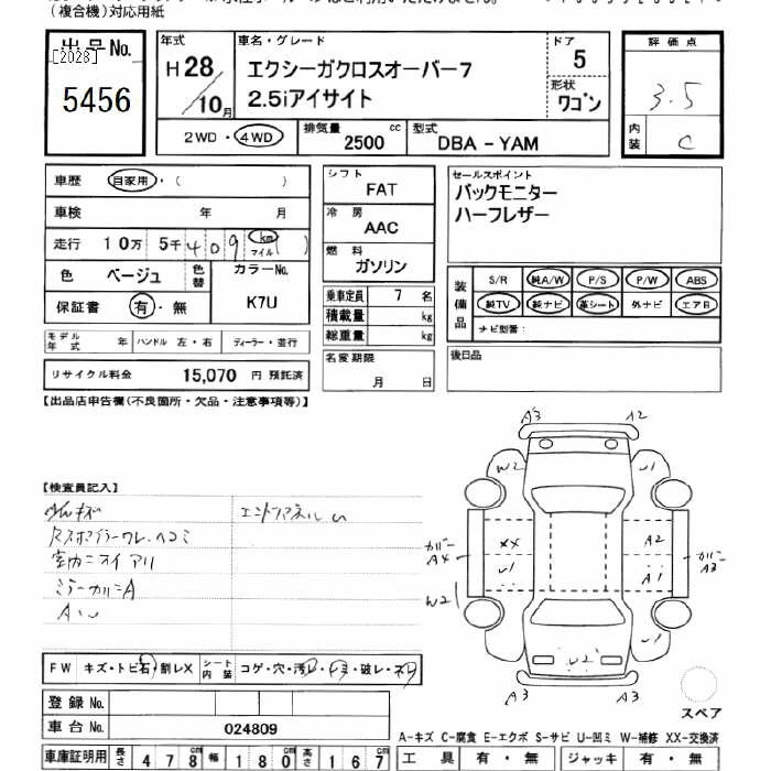 SUBARU EXIGA CROSSOVER 7 2016 г., лот № 5456