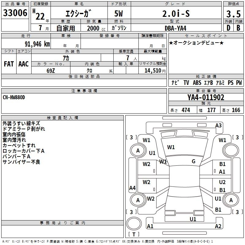 SUBARU EXIGA 2010 г., лот № 33006