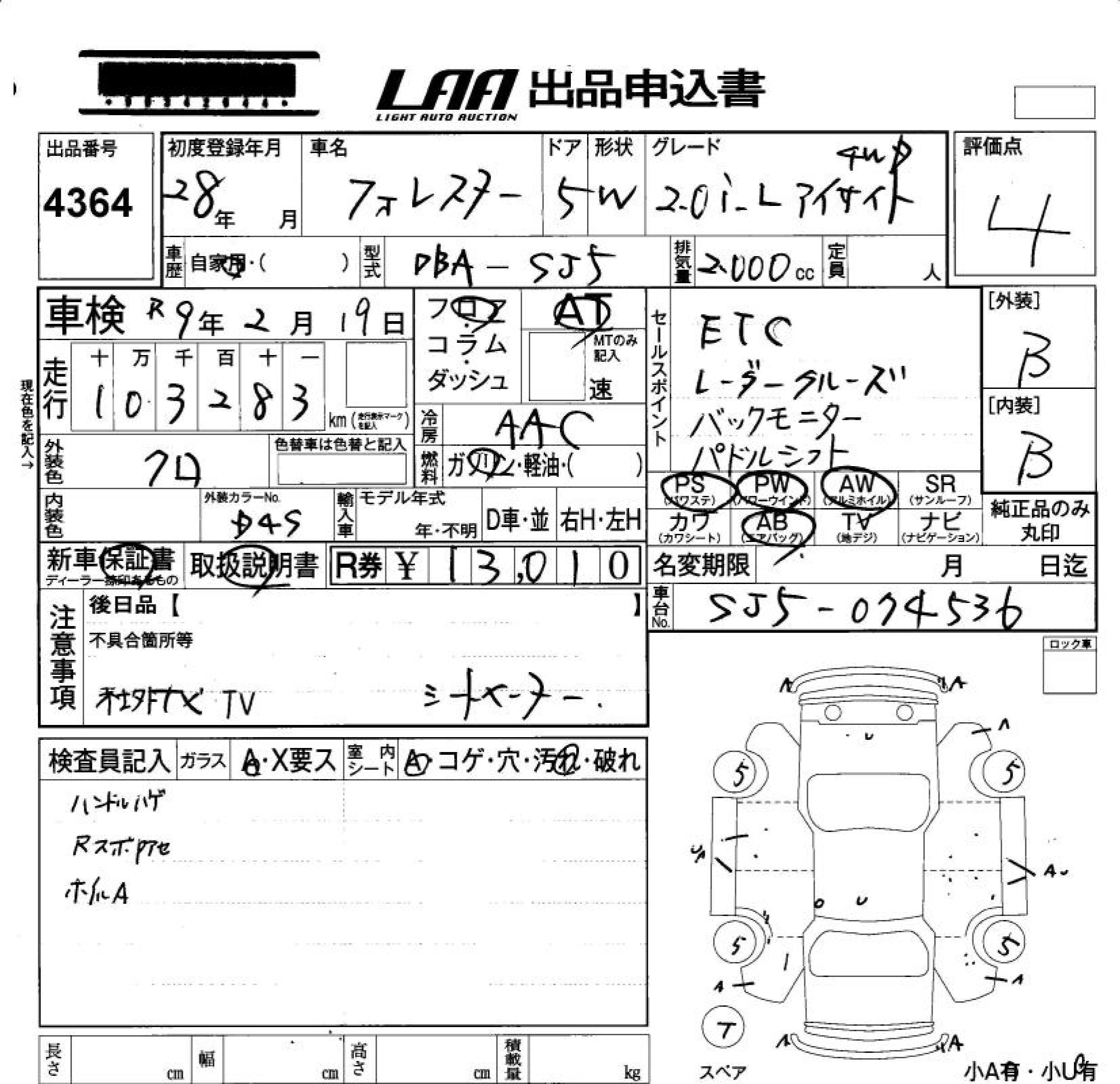 SUBARU FORESTER 2016 г., лот № 4364
