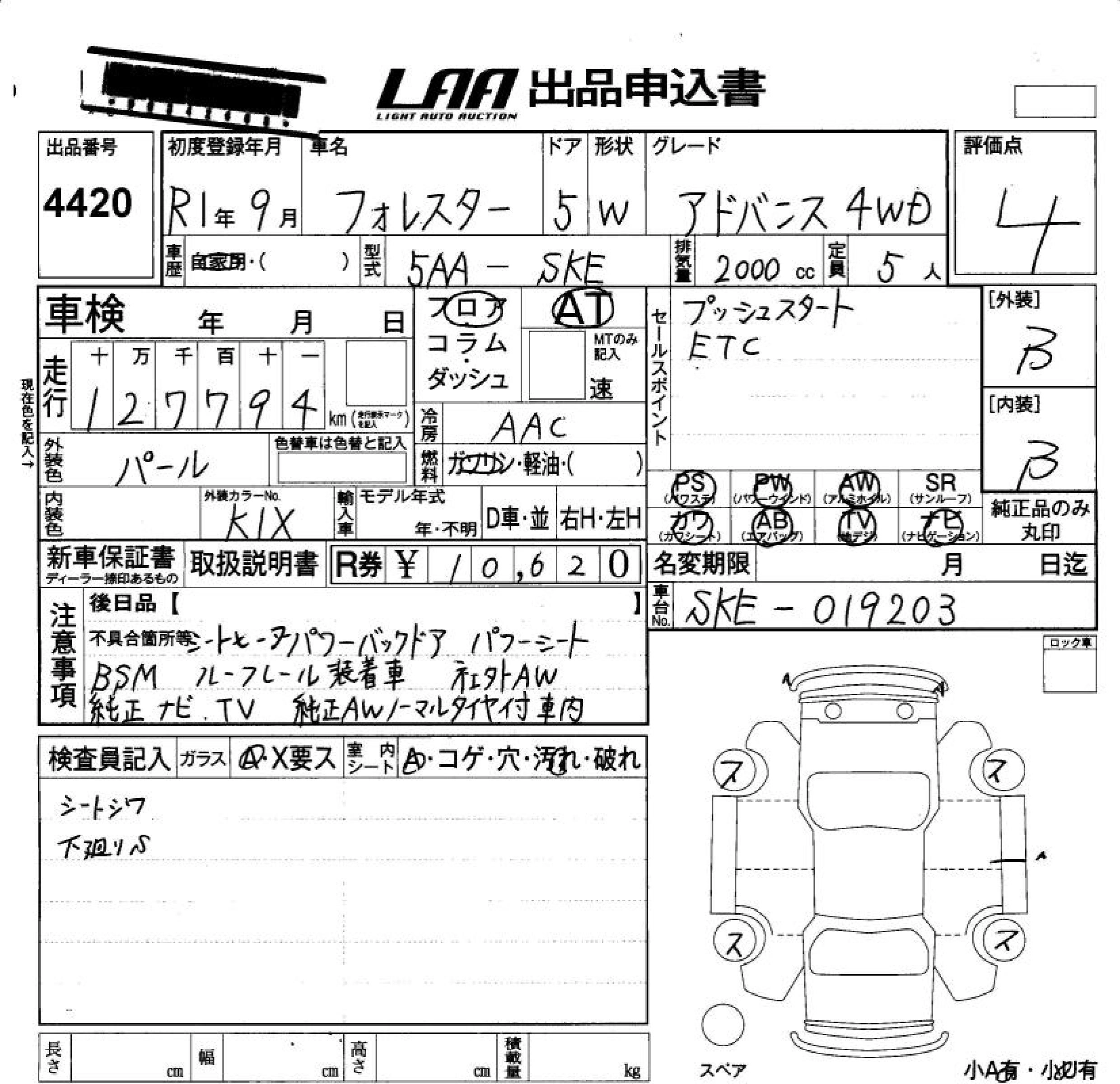 SUBARU FORESTER 2019 г., лот № 4420