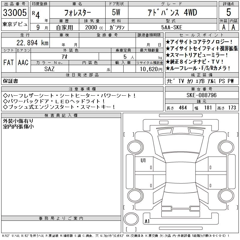 SUBARU FORESTER 2022 г., лот № 33005