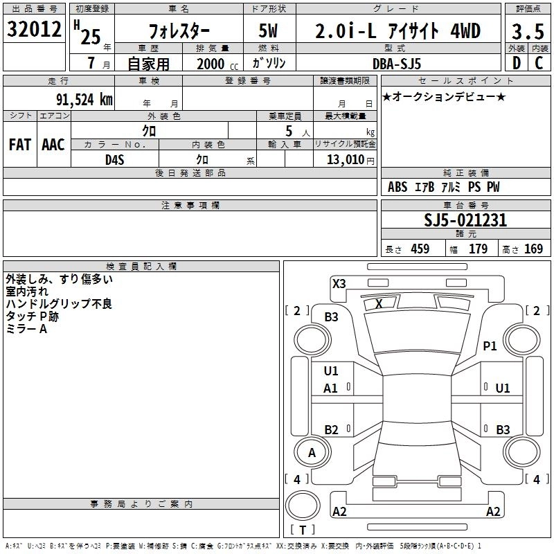 Год выпуска2013 Пробег 92 000 км КузовSJ5 Комплектация2.0I-L EYESIGHT 4WD