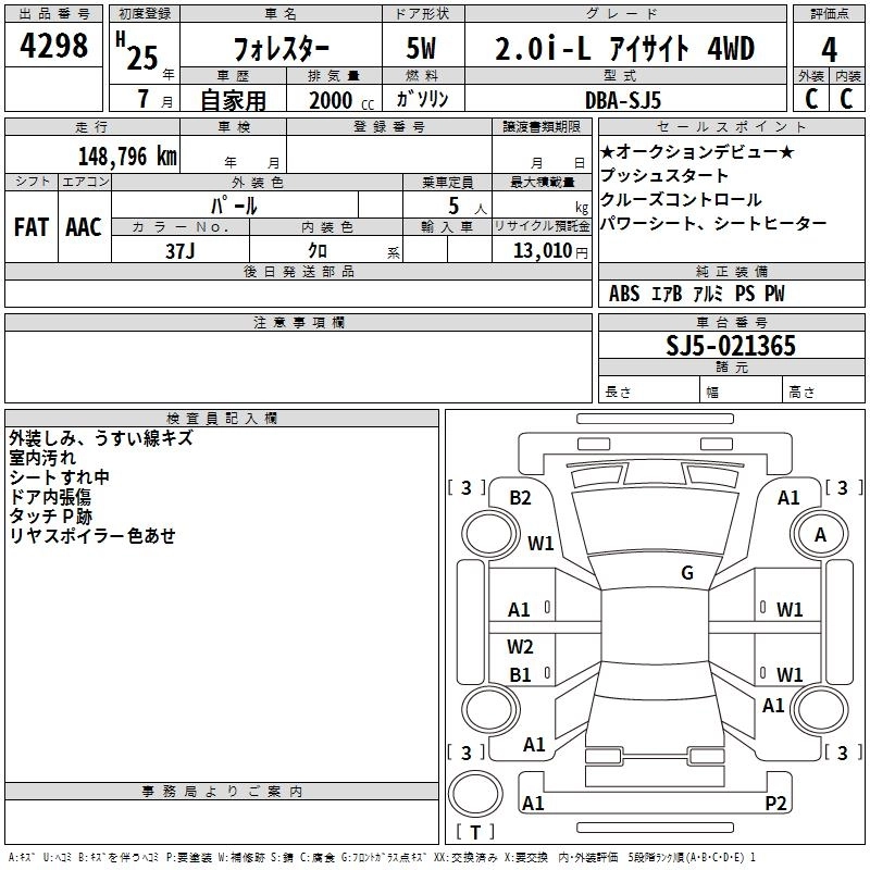 Год выпуска2013 Пробег 149 000 км КузовSJ5 Комплектация2.0I-L EYESIGHT 4WD