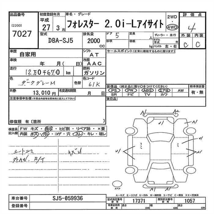 SUBARU FORESTER 2015 г., лот № 7027