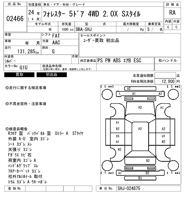 SUBARU FORESTER 2012 г., лот № 2466