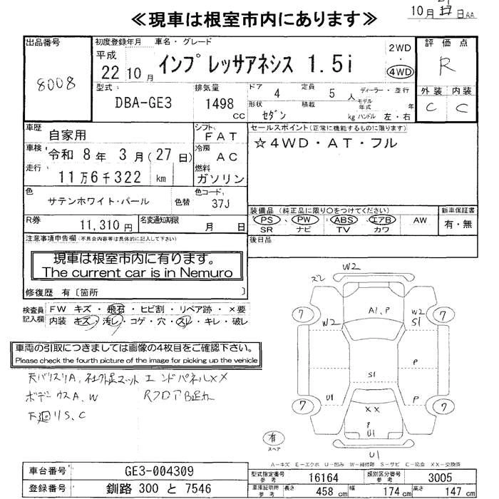 SUBARU IMPREZA ANESIS 2010 г., лот № 8008