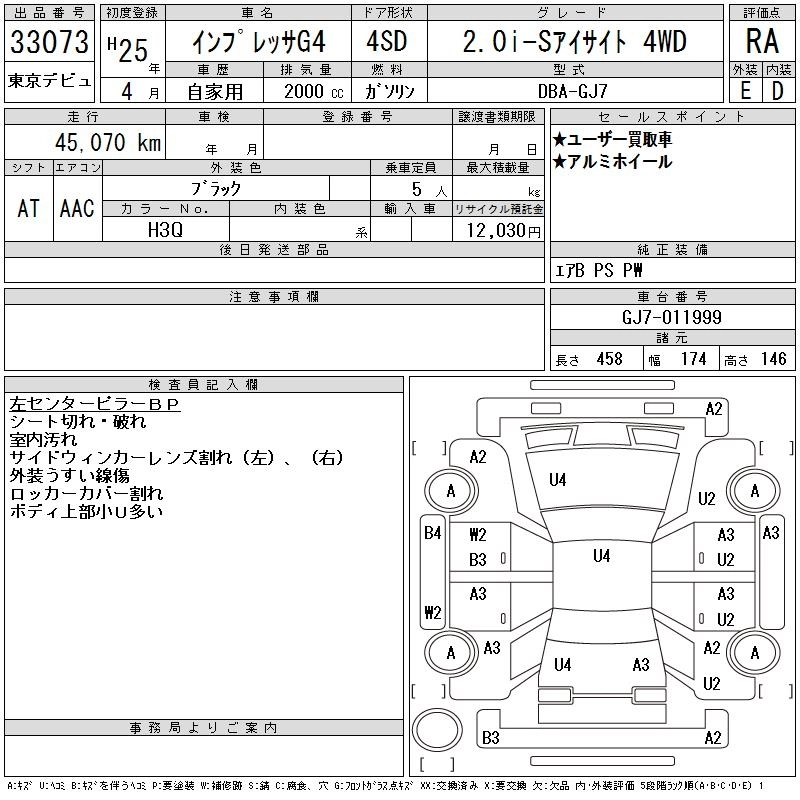 Год выпуска2013 Пробег 45 000 км КузовGJ7 Комплектация2.0I-S EYESIGHT 4WD
