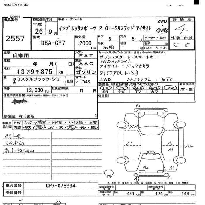 Год выпуска2014 Пробег 140 000 км КузовGP7 Комплектация4WD 2.0I-S LIMITED EYESIGHT