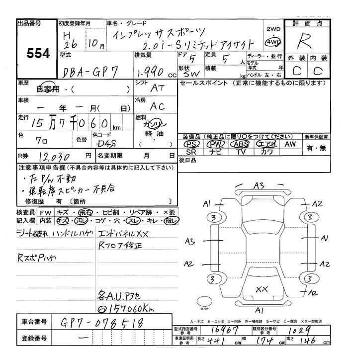 SUBARU IMPREZA SPORT 2014 г., лот № 554