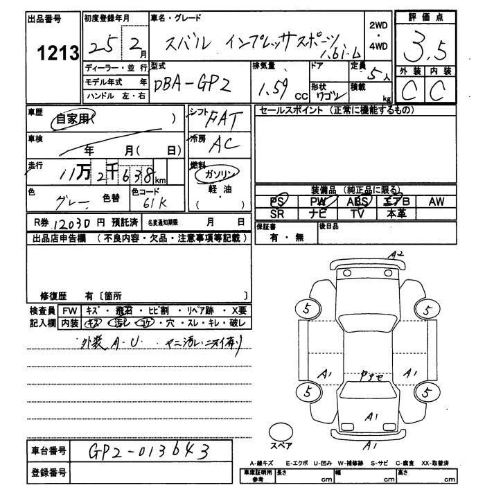 SUBARU IMPREZA SPORT 2013 г., лот № 1213
