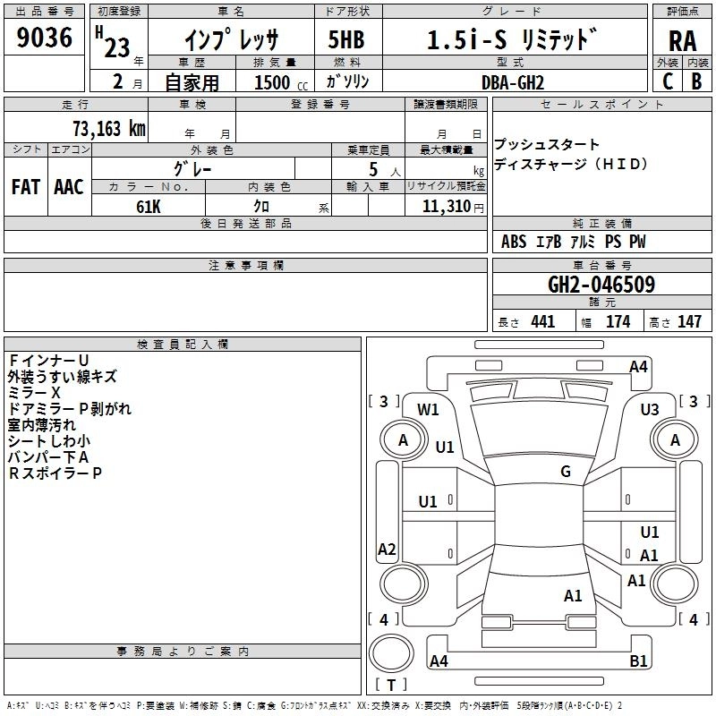 SUBARU IMPREZA 2011 г., лот № 9036