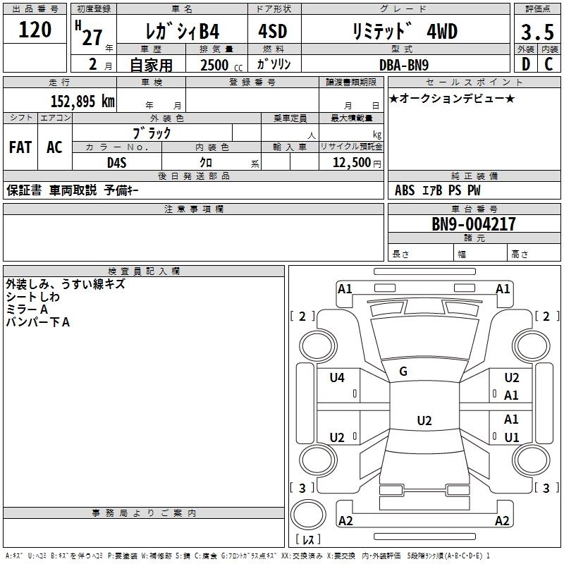 SUBARU LEGACY B4 2015 г., лот № 120