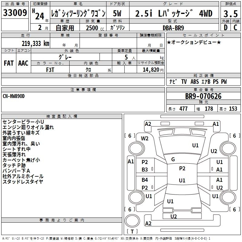 Год выпуска2012 Пробег 219 000 км КузовBR9 Комплектация2.5I L PACKAGE 4WD
