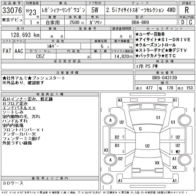 SUBARU LEGACY TOURING WAGON 2011 г., лот № 33076