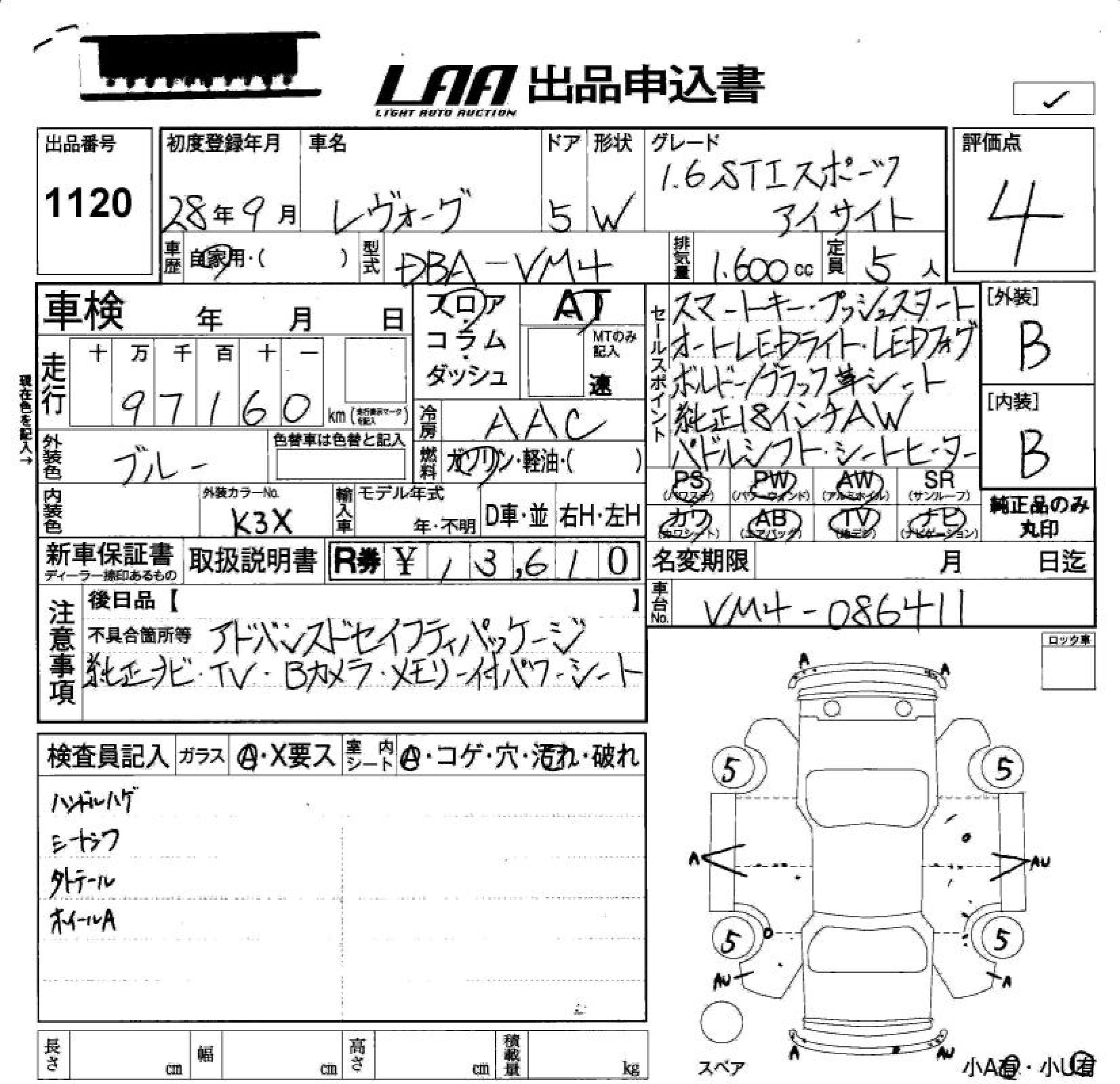 SUBARU LEVORG 2016 г., лот № 1120