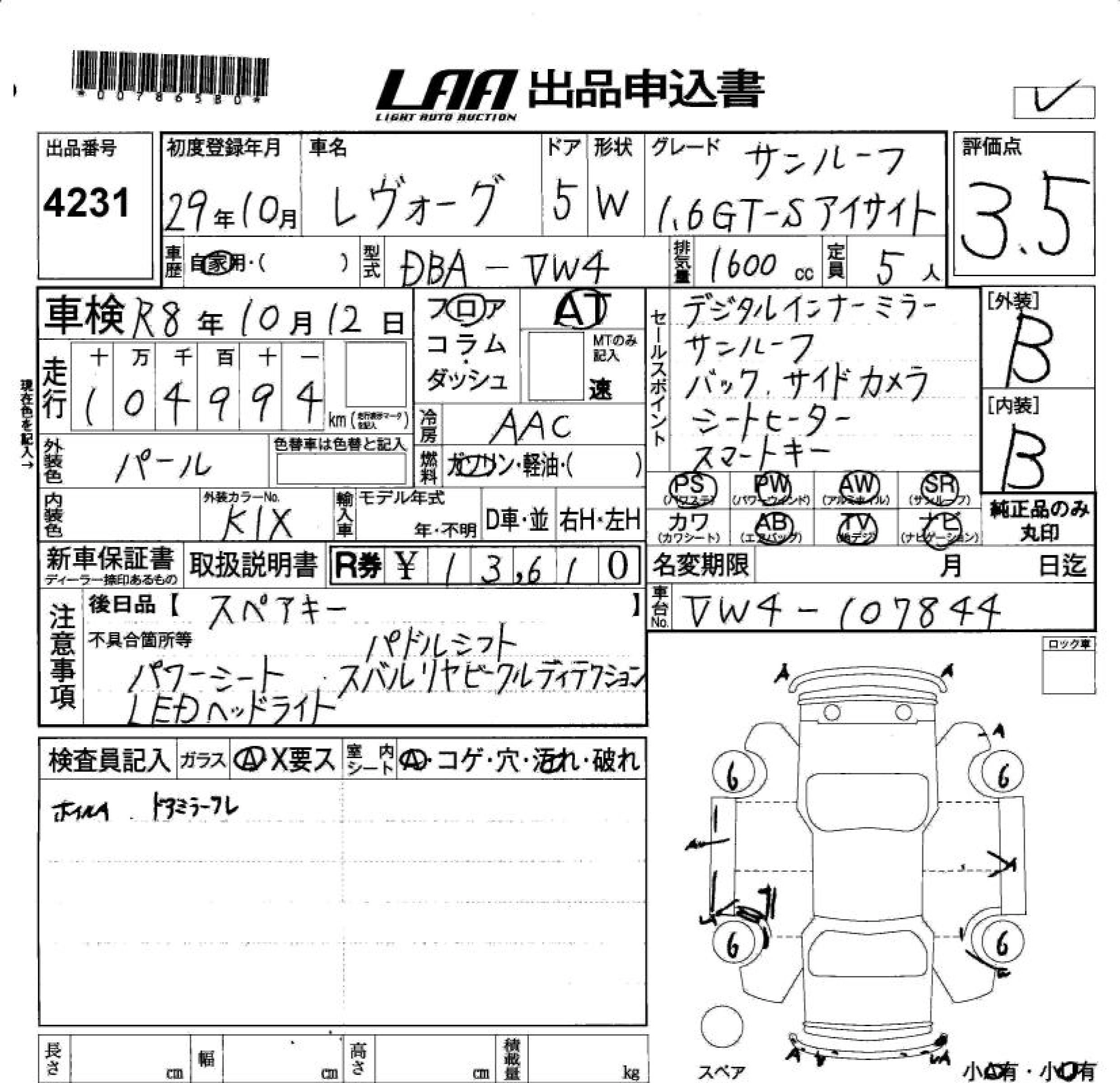 SUBARU LEVORG 2017 г., лот № 4231