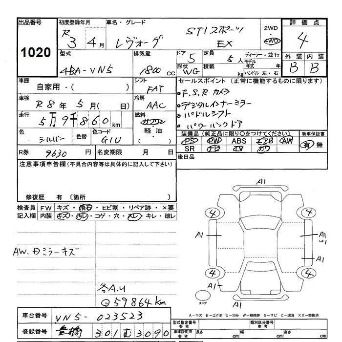 SUBARU LEVORG 2021 г., лот № 1020