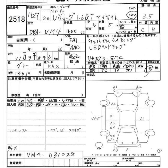 Год выпуска2015 Пробег 120 000 км КузовVM4 Комплектация4WD 1.6GT EYESIGHT
