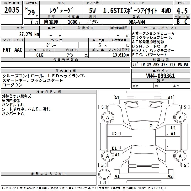 SUBARU LEVORG 2017 г., лот № 2035