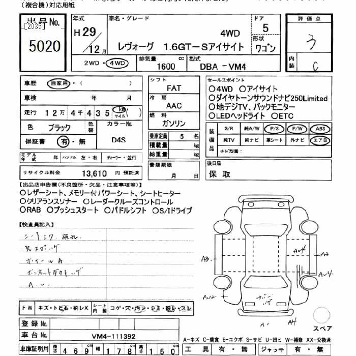SUBARU LEVORG 2017 г., лот № 5020