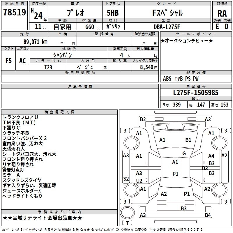 SUBARU PLEO 2012 г., лот № 78519