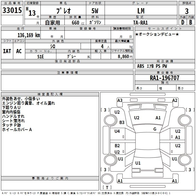 SUBARU PLEO 2001 г., лот № 33015