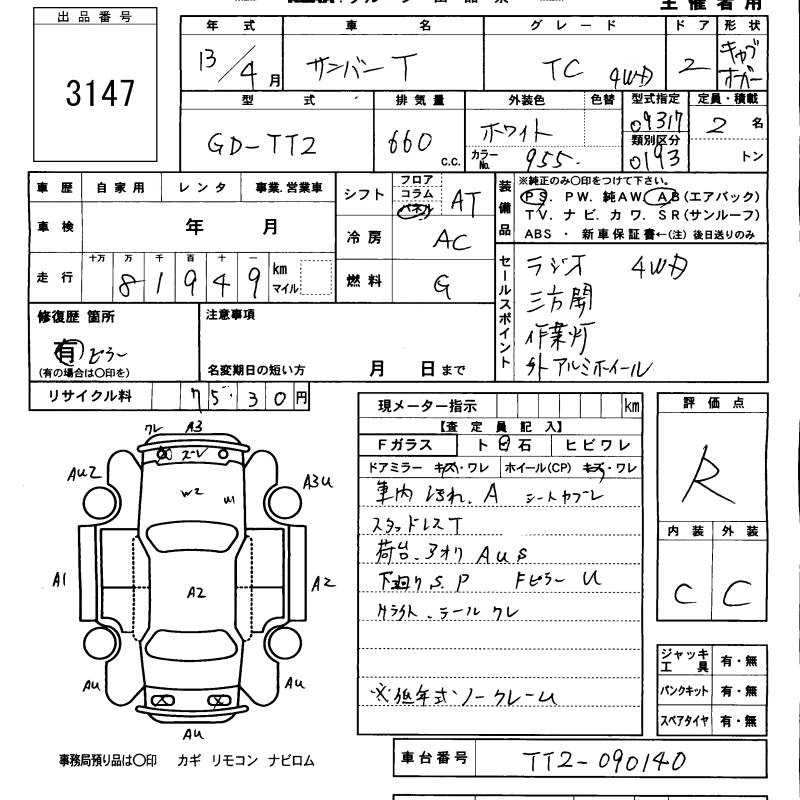 SUBARU SAMBAR TRUCK 2001 г., лот № 3147
