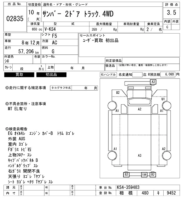 SUBARU SAMBAR TRUCK 1998 г., лот № 2835