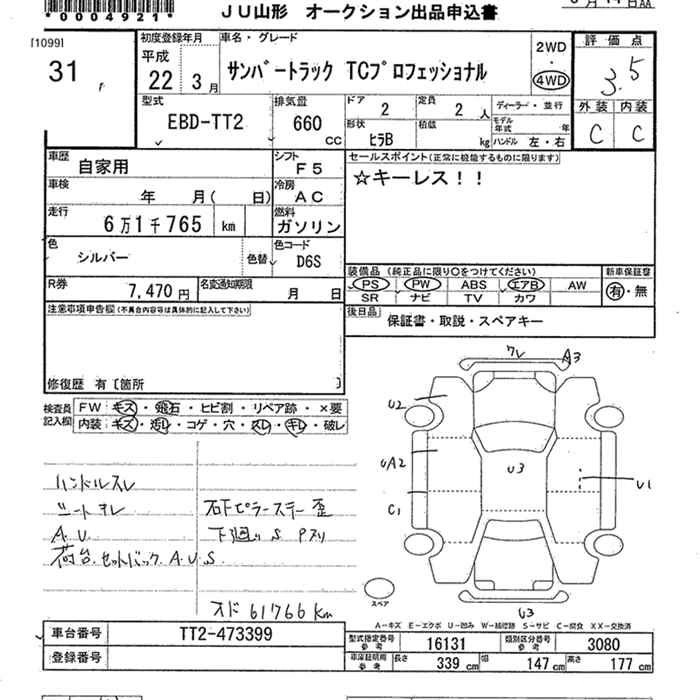 SUBARU SAMBAR TRUCK 2010 г., лот № 31