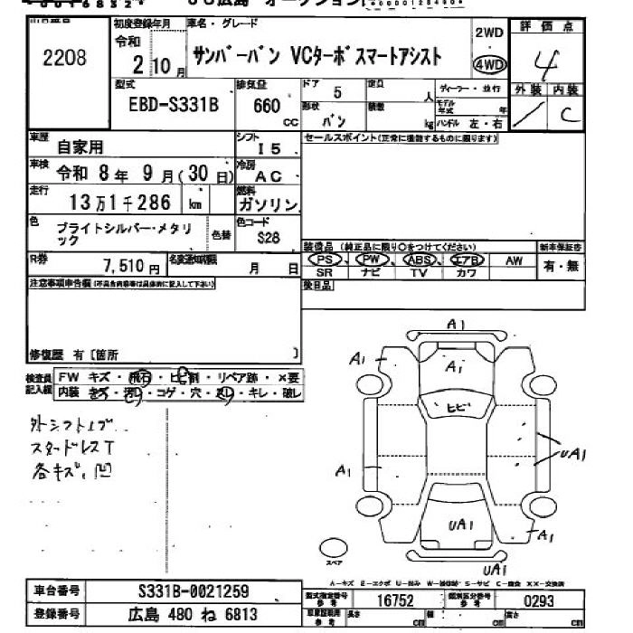 SUBARU SAMBAR VAN 2020 г., лот № 2208