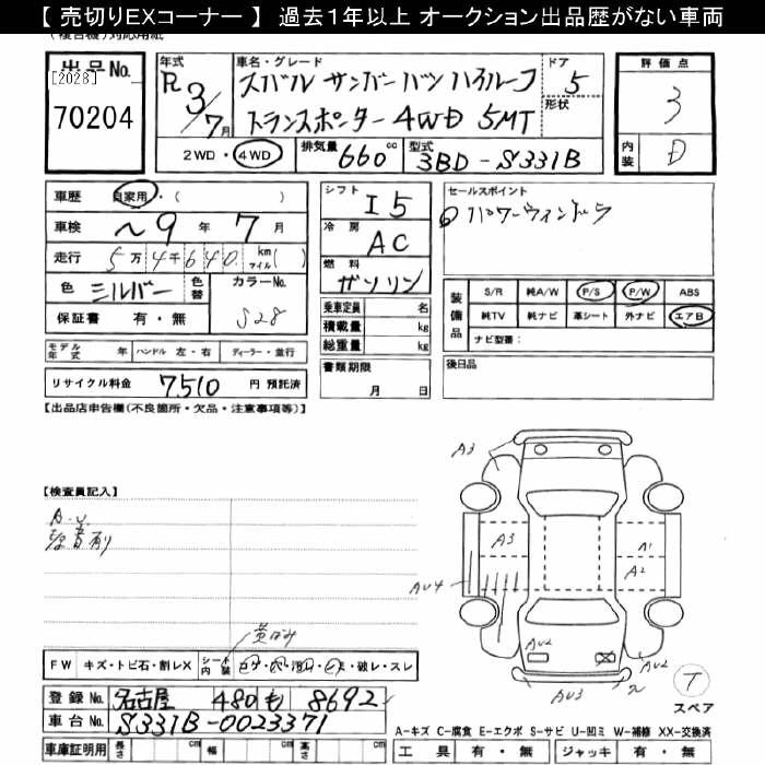 SUBARU SAMBAR VAN 2021 г., лот № 70204