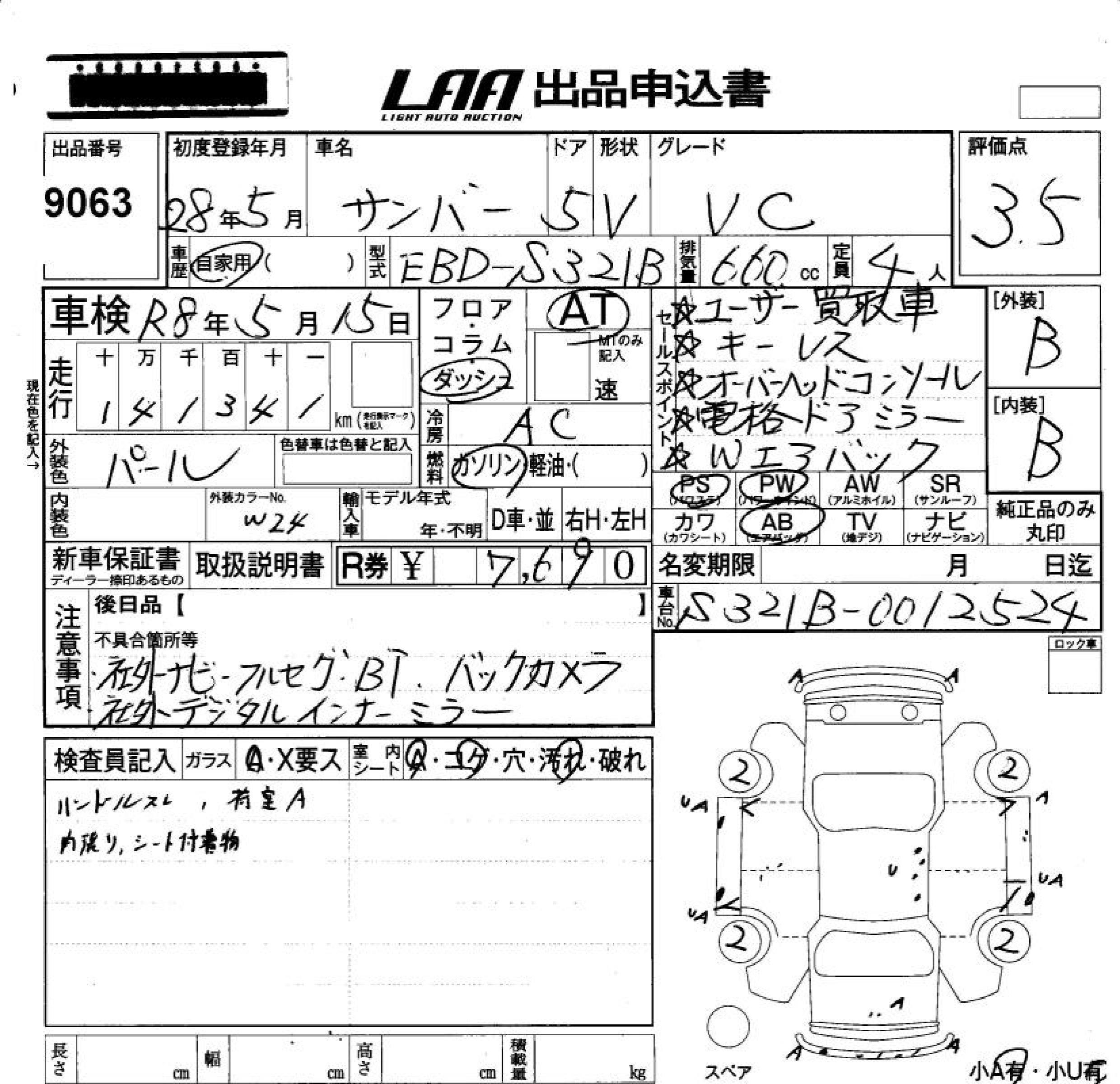 SUBARU SAMBAR VAN 2016 г., лот № 9063