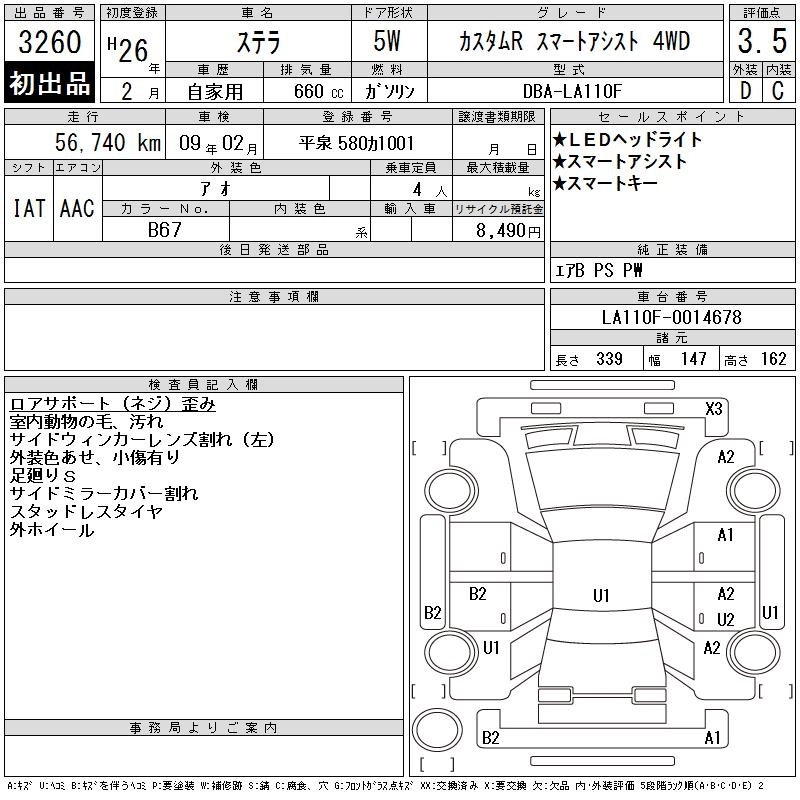 SUBARU STELLA 2014 г., лот № 3260