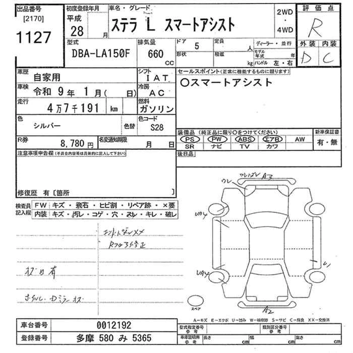 SUBARU STELLA 2016 г., лот № 1127