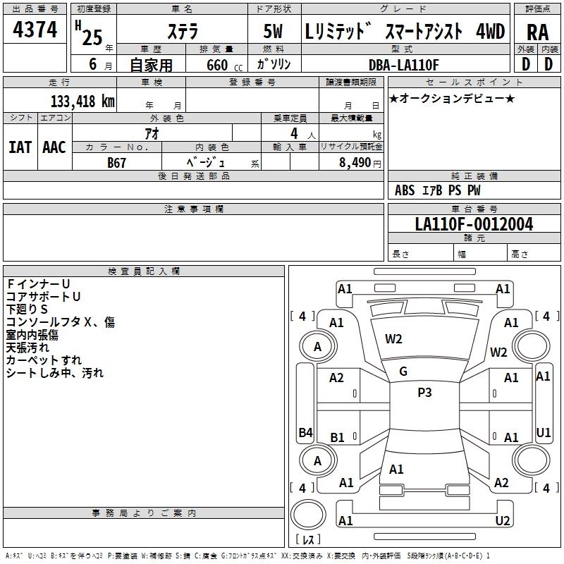 SUBARU STELLA 2013 г., лот № 4374