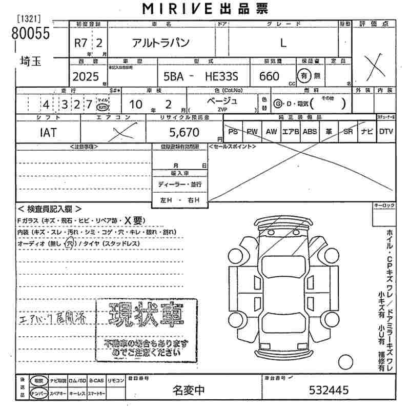 Статус выставлен на аукцион Лот 80055 Аукцион MIRIVE Saitama Дата аукциона 11.03.2026